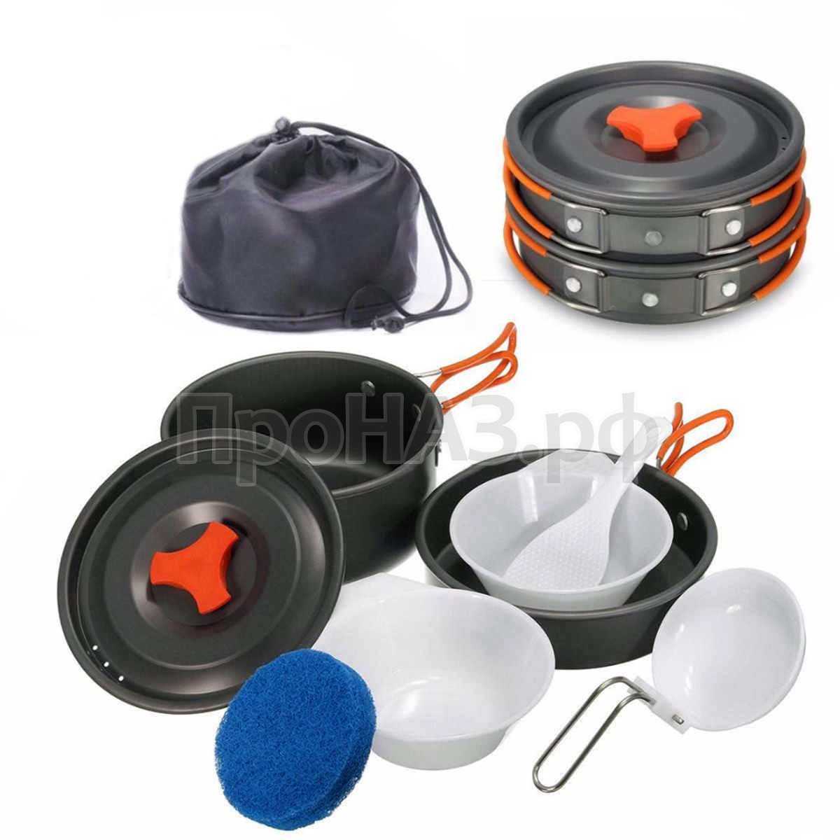 В набор входит:- кастрюля: 0.8л, 136*68 мм;- сковорода: 0.7л, 167*39 мм;- 2 пластиковые миски;- складной пластиковый половник;- деревянная лопатка;- губка для мытья посуды.