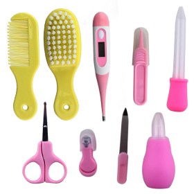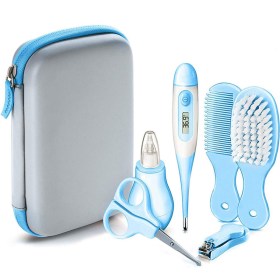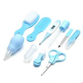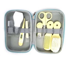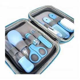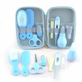 Такой набор можно смело дарить новоиспеченной маме, поскольку здесь есть все необходимые аксессуары. Маленькая расческа с круглыми шариками на зубчиках обезопасит нежную кожу головы от травм. Также пригодится расческа-щетка с искусственной мягкой щетиной. Аккуратно и безболезненно подстричь ногти у ребенка вы сможете с помощью специальных щипчиков для ногтей с закругленными стальными лезвиями. Для этих целей пригодятся и маникюрные ножницы с закругленными краями. Благодаря зубной силиконовой щеточке, можно приучать ребенка к гигиене. А детский назальный аспиратор станет настоящей находкой тогда, когда нужно безопасно очистить носик малыша. Электронный цифровой термометр с гибким наконечником позволит оперативно и точно измерить температуру подмышкой или во рту. Все эти инструменты аккуратно сложены в кейсе на змейке.