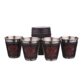 Подарочный набор из 4-х малых стопок в футляре с изображением Герба станет приятным сувениром товарищу по службе, близкому другу, любимому мужчине на 23 февраля или к любому другому празднику!