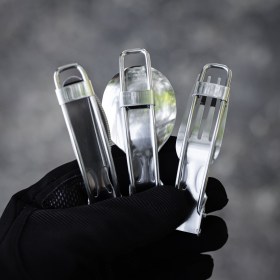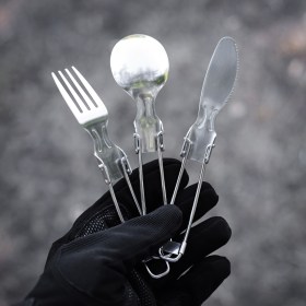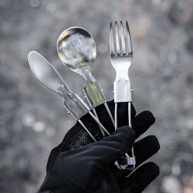 - походный набор складных столовых приборов состоит из ножа, вилки и ложки, поставляются в удобном чехле для хранения