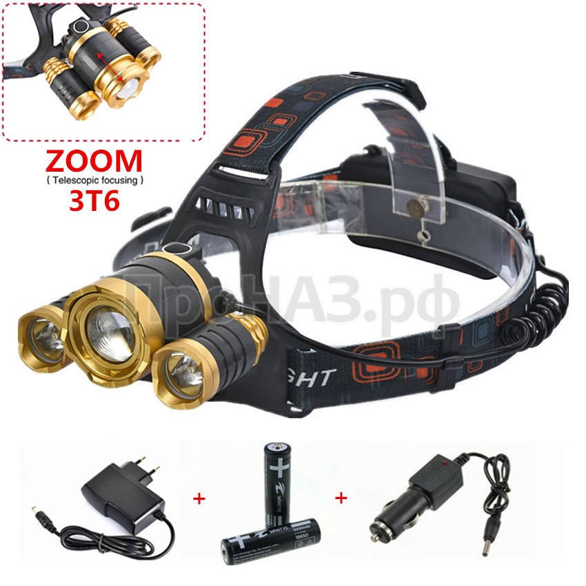 Налобный фонарь Boruit HL-006 — сверх яркий налобный фонарь с основным светодиодом Cree XM–L T6 и двумя вспомогательными светодиодами Cree Q5. Максимальная яркость при работе трёх светодиодов одновременно — 2200 Lumen. Фонарь имеет 3 режима работы (основной, 2 диода, 3 диода) и стробоскоп. В комплект уже входит зарядное устройство от сети, зарядное устройство от прикуривателя в автомобиле и 2 аккумулятора 18650.