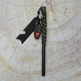 Стержень огнива выполнен из ферроцерия (сплав не менее чем из 7 редкоземельных металлов), в паре с кресалом из нержавеющей стали, обеспечивающее высечение искр, паракордом и свистком.
