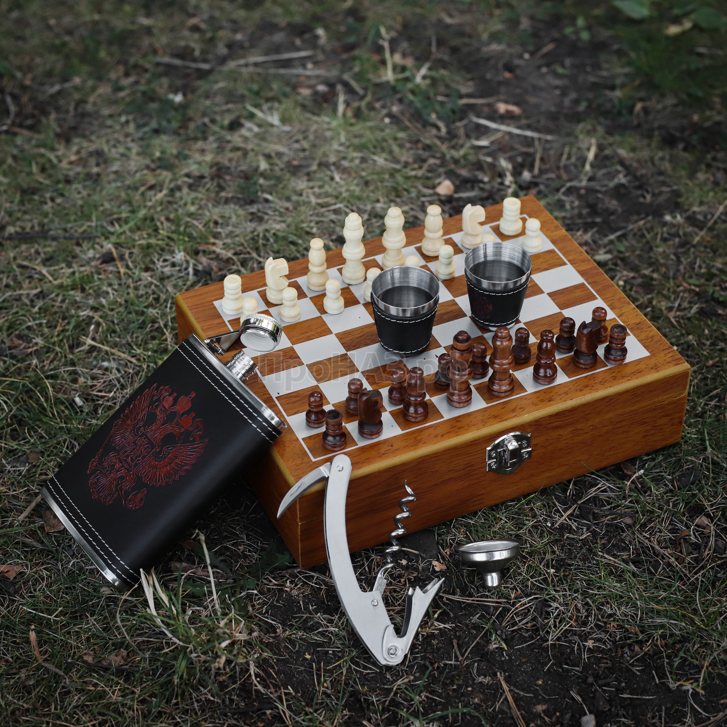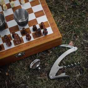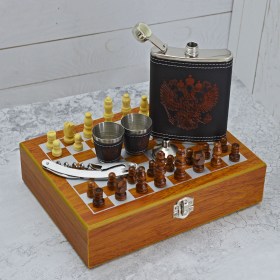 Походные и подарочные шахматы, фляга, 2 стаканчика, воронка и мультитул в чемодане. Фигурки дерево, размер поля 24х18 см.