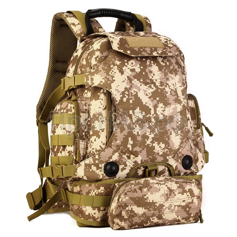 • Особенности строения: Спереди на рюкзаке - защитная накладка, которая крепится на карабины, и застегивается сверху на клапан, с нашитой на него ворсовой тканью для шевронов и т.д. Под накладкой находится отделение 35х25 см с двумя карманами 14х14 см. Спереди на уровне пояса у рюкзака есть пристегной карман 22х10х15 см с нашитыми стропами. По бокам рюкзака- два кармана 20х4х11 см. Основное большое отделение размером 43х35х15 см, в нем карман 25х30 см. Спинка рюкзака и лямки, со стороны прилегающей к телу, прошиты поролоном и тканью-сеткой, которые обеспечат максимальный комфорт. На лямках есть стропы для навешивания дополнительных аксессуаров. Для переноски рюкзака в одной руке есть ручка с прорезиненным покрытием.