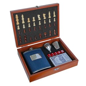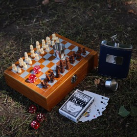 Красивый мужской подарочный набор: Шахматы, (можно играть в шашки) и фляжный набор.