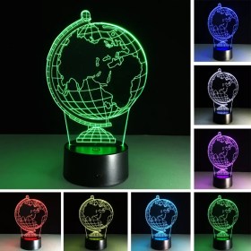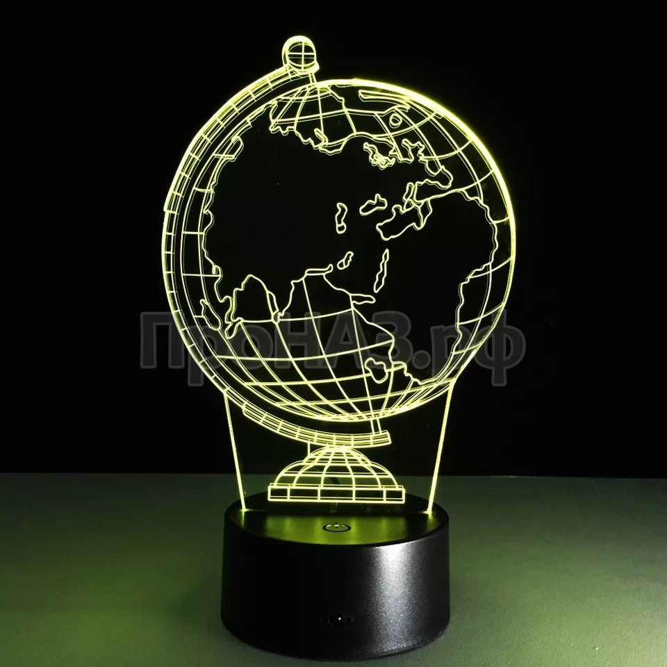 Светильник-ночник 3D «Глобус» - модный сувенир и полезное приобретение для дома и офиса. За счет специальной конструкции светильника, оригинальная схема линий-световодов создает эффект 3D модели. Рисунок состоит из тонких линий, реализующих объемную фигуру. Рисунок надежно нанесен на прозрачную пластину (акриловая доска), которая вставляется в прорезь несущего основания со светодиодами. Тонкие линии в темноте создают иллюзию объема - 3D. Светильник послужит отличным и запоминающимся подарком для путешественников и юных географов.