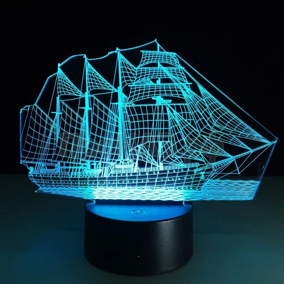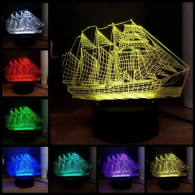 Светильник-ночник 3D «Корабль» - модный сувенир и полезное приобретение для дома и офиса. За счет специальной конструкции светильника, оригинальная схема линий-световодов создает эффект 3D модели. Рисунок состоит из тонких линий, реализующих объемную фигуру. Рисунок надежно нанесен на прозрачную пластину (акриловая доска), которая вставляется в прорезь несущего основания со светодиодами. Тонкие линии в темноте создают иллюзию объема - 3D. Светильник послужит отличным и запоминающимся подарком.