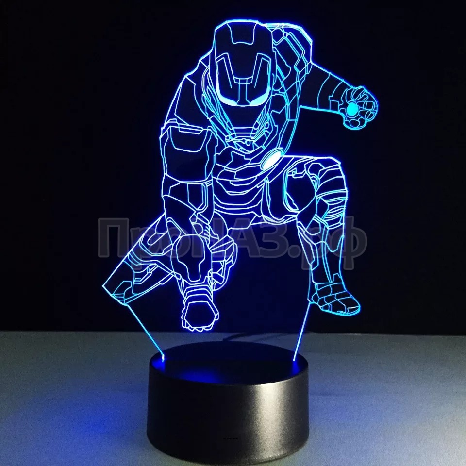 Светильник-ночник 3D «Железный человек» - модный сувенир и полезное приобретение для дома и офиса. За счет специальной конструкции светильника, оригинальная схема линий-световодов создает эффект 3D модели. Рисунок состоит из тонких линий, реализующих объемную фигуру. Рисунок надежно нанесен на прозрачную пластину (акриловая доска), которая вставляется в прорезь несущего основания со светодиодами. Тонкие линии в темноте создают иллюзию объема - 3D. Светильник послужит отличным и запоминающимся подарком ребенку на день рождение, на новый год и на любой другой случай.