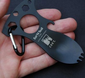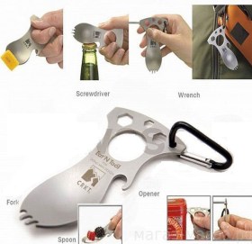 Универсальный инструмент с набором функций: ложка, вилка, открывалка для бутылок, гаечный ключ 10 мм, гаечный ключ 8 мм, гаечный ключ 6 мм, отвертка, карабин для крепления на ключи.