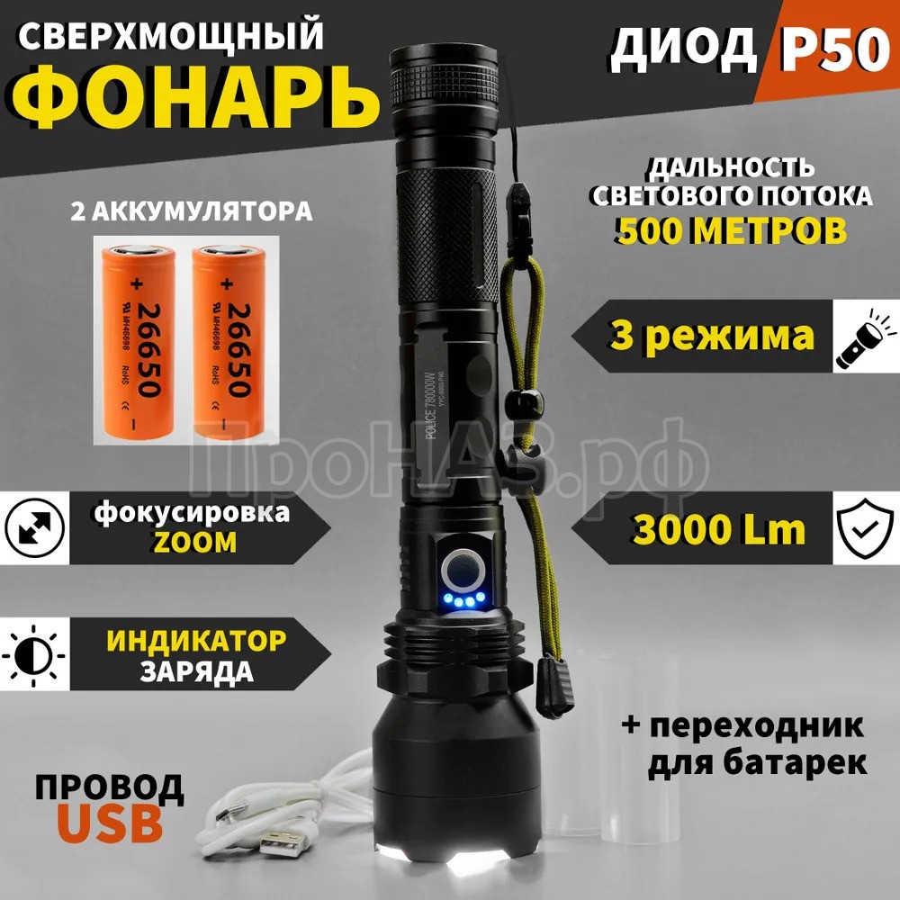 Заряжать фонарь можно от любого блока питания для телефона (5 V/1A/2A ), POWER BANK, автомобильной зарядки или ноутбука.