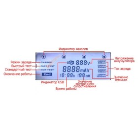 - Напряжение и ток заряда: для Ni-Mh/Ni-Cd: 1.48V, 300mA/500mA/700mA/1000mA (ток заряда в 1000 mA можно одновременно задавать на все 4 канала)