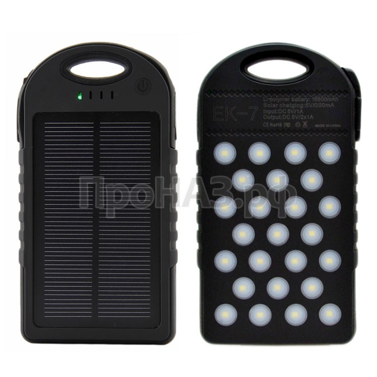 Power Bank Solar EK-7 оснащен светодиодным фонариком (включается двойным нажатием на кнопку включения) и двумя разъемами USB 5V, можно заряжать одновременно два устройства.